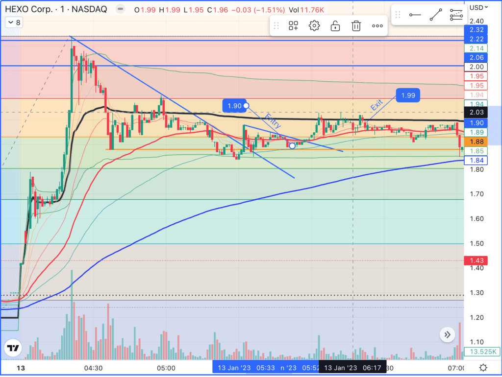 Profit of 9c/share. Could have cashed 12-13. Entry at confirmed support after a broken downtrend. Exit too late, at resistance. I got lucky here. Ticker: HEXO
